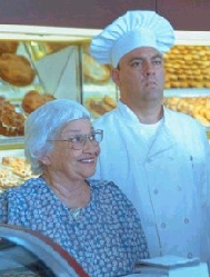 At the table stood an older lady with a younger man, playing the roles of Mrs. Kowalski and Vol Kowalski, owners of The Kowalski Bakery.