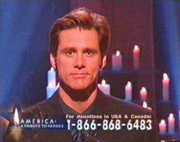 Jim Carrey told the touching story of two survivors who carried a woman in a wheelchair 68 stories down the stairs to escape from the twin towers because she had been unable to save herself, without even knowing her name. He also answered the phone to take donations from viewers.